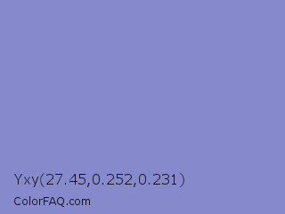 Yxy 27.45,0.252,0.231 Color is a light blue color and the nearest color is Chetwode Blue #8581d9. Hex code #8789cd and RGB value is rgb(135,137,205). In RGB color space, this color is composed of 53% red, 54% green, 80% blue, In CMYK color space, this color is composed of 34% cyan, 33% magenta, 0% yellow , 20% black , In HSL color space, this color has a hue angle of 238° , 41% saturation and 67% lightness.
