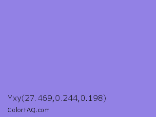 Yxy 27.469,0.244,0.198 Color is a light indigo color and the nearest color is Chetwode Blue #8581d9. Hex code #9281e5 and RGB value is rgb(146,129,229). In RGB color space, this color is composed of 57% red, 51% green, 90% blue, In CMYK color space, this color is composed of 36% cyan, 44% magenta, 0% yellow , 10% black , In HSL color space, this color has a hue angle of 250° , 66% saturation and 70% lightness.