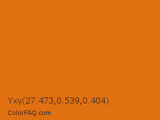 Yxy 27.473,0.539,0.404 Color is a normal orange color and the nearest color is Christine #e7730a. Hex code #e07010 and RGB value is rgb(224,112,16). In RGB color space, this color is composed of 88% red, 44% green, 6% blue, In CMYK color space, this color is composed of 0% cyan, 50% magenta, 93% yellow , 12% black , In HSL color space, this color has a hue angle of 28° , 87% saturation and 47% lightness.