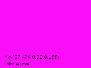 Yxy 27.474,0.32,0.155 Color is a normal magenta color and the nearest color is Magenta / Fuchsia #ff00ff. Hex code #fa0efa and RGB value is rgb(250,14,250). In RGB color space, this color is composed of 98% red, 5% green, 98% blue, In CMYK color space, this color is composed of 0% cyan, 94% magenta, 0% yellow , 2% black , In HSL color space, this color has a hue angle of 300° , 96% saturation and 52% lightness.