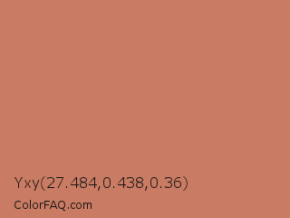 Yxy 27.484,0.438,0.36 Color is a normal red color and the nearest color is Contessa #c6726b. Hex code #c97b63 and RGB value is rgb(201,123,99). In RGB color space, this color is composed of 79% red, 48% green, 39% blue, In CMYK color space, this color is composed of 0% cyan, 39% magenta, 51% yellow , 21% black , In HSL color space, this color has a hue angle of 14° , 49% saturation and 59% lightness.