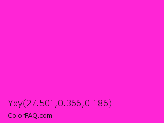Yxy 27.501,0.366,0.186 Color is a normal magenta color and the nearest color is Hot Magenta #ff1dce. Hex code #ff25d6 and RGB value is rgb(255,37,214). In RGB color space, this color is composed of 100% red, 15% green, 84% blue, In CMYK color space, this color is composed of 0% cyan, 85% magenta, 16% yellow , 0% black , In HSL color space, this color has a hue angle of 311° , 100% saturation and 57% lightness.