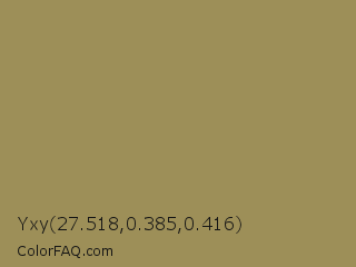 Yxy 27.518,0.385,0.416 Color is a normal yellow color and the nearest color is Barley Corn #a68b5b. Hex code #9d8f58 and RGB value is rgb(157,143,88). In RGB color space, this color is composed of 62% red, 56% green, 35% blue, In CMYK color space, this color is composed of 0% cyan, 9% magenta, 44% yellow , 38% black , In HSL color space, this color has a hue angle of 48° , 28% saturation and 48% lightness.