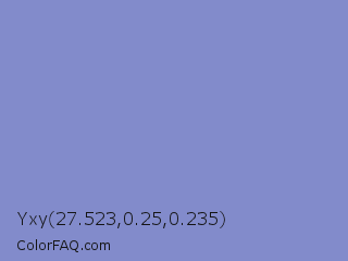 Yxy 27.523,0.25,0.235 Color is a light blue color and the nearest color is Chetwode Blue #8581d9. Hex code #828bcb and RGB value is rgb(130,139,203). In RGB color space, this color is composed of 51% red, 55% green, 80% blue, In CMYK color space, this color is composed of 36% cyan, 32% magenta, 0% yellow , 20% black , In HSL color space, this color has a hue angle of 233° , 41% saturation and 65% lightness.