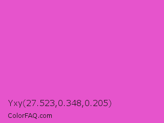 Yxy 27.523,0.348,0.205 Color is a light magenta color and the nearest color is Light Deep Pink #ff5ccd. Hex code #e654cc and RGB value is rgb(230,84,204). In RGB color space, this color is composed of 90% red, 33% green, 80% blue, In CMYK color space, this color is composed of 0% cyan, 63% magenta, 11% yellow , 10% black , In HSL color space, this color has a hue angle of 311° , 74% saturation and 62% lightness.