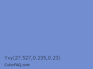 Yxy 27.527,0.235,0.23 Color is a light blue color and the nearest color is Blue Gray #6699cc. Hex code #728ed1 and RGB value is rgb(114,142,209). In RGB color space, this color is composed of 45% red, 56% green, 82% blue, In CMYK color space, this color is composed of 45% cyan, 32% magenta, 0% yellow , 18% black , In HSL color space, this color has a hue angle of 222° , 51% saturation and 63% lightness.