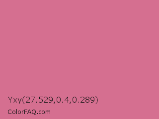 Yxy 27.529,0.4,0.289 Color is a light rose color and the nearest color is Charm #d47494. Hex code #d56f90 and RGB value is rgb(213,111,144). In RGB color space, this color is composed of 84% red, 44% green, 56% blue, In CMYK color space, this color is composed of 0% cyan, 48% magenta, 32% yellow , 16% black , In HSL color space, this color has a hue angle of 341° , 55% saturation and 64% lightness.