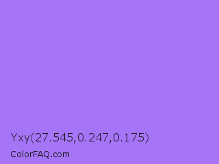 Yxy 27.545,0.247,0.175 Color is a light violet color and the nearest color is Lavender #b57edc. Hex code #a675f7 and RGB value is rgb(166,117,247). In RGB color space, this color is composed of 65% red, 46% green, 97% blue, In CMYK color space, this color is composed of 33% cyan, 53% magenta, 0% yellow , 3% black , In HSL color space, this color has a hue angle of 263° , 89% saturation and 71% lightness.