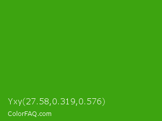Yxy 27.58,0.319,0.576 Color is a normal green color and the nearest color is Slimy Green #299617. Hex code #3da410 and RGB value is rgb(61,164,16). In RGB color space, this color is composed of 24% red, 64% green, 6% blue, In CMYK color space, this color is composed of 63% cyan, 0% magenta, 90% yellow , 36% black , In HSL color space, this color has a hue angle of 102° , 82% saturation and 35% lightness.