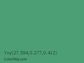 Yxy 27.594,0.277,0.412 Color is a normal green color and the nearest color is Ocean Green #41aa78. Hex code #4c9f74 and RGB value is rgb(76,159,116). In RGB color space, this color is composed of 30% red, 62% green, 45% blue, In CMYK color space, this color is composed of 52% cyan, 0% magenta, 27% yellow , 38% black , In HSL color space, this color has a hue angle of 149° , 35% saturation and 46% lightness.