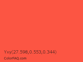 Yxy 27.598,0.553,0.344 Color is a light red color and the nearest color is Ogre Odor #fd5240. Hex code #fc5543 and RGB value is rgb(252,85,67). In RGB color space, this color is composed of 99% red, 33% green, 26% blue, In CMYK color space, this color is composed of 0% cyan, 66% magenta, 73% yellow , 1% black , In HSL color space, this color has a hue angle of 6° , 97% saturation and 63% lightness.