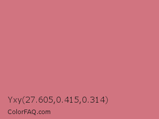 Yxy 27.605,0.415,0.314 Color is a light red color and the nearest color is New York Pink #d7837f. Hex code #d17480 and RGB value is rgb(209,116,128). In RGB color space, this color is composed of 82% red, 45% green, 50% blue, In CMYK color space, this color is composed of 0% cyan, 44% magenta, 39% yellow , 18% black , In HSL color space, this color has a hue angle of 352° , 50% saturation and 64% lightness.