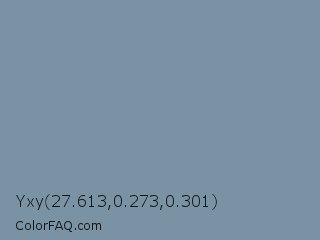 Yxy 27.613,0.273,0.301 Color is a normal blue color and the nearest color is Shadow Blue #778ba5. Hex code #7993a4 and RGB value is rgb(121,147,164). In RGB color space, this color is composed of 47% red, 58% green, 64% blue, In CMYK color space, this color is composed of 26% cyan, 10% magenta, 0% yellow , 36% black , In HSL color space, this color has a hue angle of 204° , 19% saturation and 56% lightness.