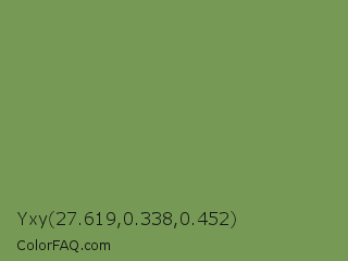 Yxy 27.619,0.338,0.452 Color is a normal green color and the nearest color is Asparagus Green #7ba05b. Hex code #769a55 and RGB value is rgb(118,154,85). In RGB color space, this color is composed of 46% red, 60% green, 33% blue, In CMYK color space, this color is composed of 23% cyan, 0% magenta, 45% yellow , 40% black , In HSL color space, this color has a hue angle of 91° , 29% saturation and 47% lightness.