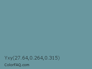 Yxy 27.64,0.264,0.315 Color is a normal cyan color and the nearest color is Gothic #6d92a1. Hex code #69979f and RGB value is rgb(105,151,159). In RGB color space, this color is composed of 41% red, 59% green, 62% blue, In CMYK color space, this color is composed of 34% cyan, 5% magenta, 0% yellow , 38% black , In HSL color space, this color has a hue angle of 189° , 22% saturation and 52% lightness.