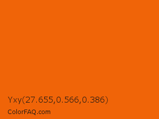 Yxy 27.655,0.566,0.386 Color is a normal orange color and the nearest color is Spanish Orange #e86100. Hex code #f06408 and RGB value is rgb(240,100,8). In RGB color space, this color is composed of 94% red, 39% green, 3% blue, In CMYK color space, this color is composed of 0% cyan, 58% magenta, 97% yellow , 6% black , In HSL color space, this color has a hue angle of 24° , 94% saturation and 49% lightness.