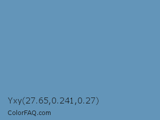 Yxy 27.65,0.241,0.27 Color is a normal blue color and the nearest color is Silver Lake Blue #5d89ba. Hex code #6395b9 and RGB value is rgb(99,149,185). In RGB color space, this color is composed of 39% red, 58% green, 73% blue, In CMYK color space, this color is composed of 46% cyan, 19% magenta, 0% yellow , 27% black , In HSL color space, this color has a hue angle of 205° , 38% saturation and 56% lightness.