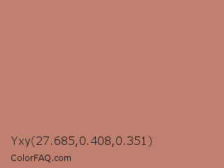 Yxy 27.685,0.408,0.351 Color is a normal red color and the nearest color is Contessa #c6726b. Hex code #bf8070 and RGB value is rgb(191,128,112). In RGB color space, this color is composed of 75% red, 50% green, 44% blue, In CMYK color space, this color is composed of 0% cyan, 33% magenta, 41% yellow , 25% black , In HSL color space, this color has a hue angle of 12° , 38% saturation and 59% lightness.