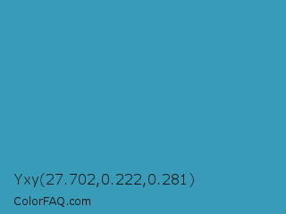 Yxy 27.702,0.222,0.281 Color is a normal cyan color and the nearest color is Boston Blue #3b91b4. Hex code #389bb7 and RGB value is rgb(56,155,183). In RGB color space, this color is composed of 22% red, 61% green, 72% blue, In CMYK color space, this color is composed of 69% cyan, 15% magenta, 0% yellow , 28% black , In HSL color space, this color has a hue angle of 193° , 53% saturation and 47% lightness.