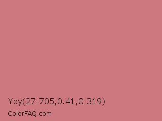 Yxy 27.705,0.41,0.319 Color is a light red color and the nearest color is New York Pink #d7837f. Hex code #cd777f and RGB value is rgb(205,119,127). In RGB color space, this color is composed of 80% red, 47% green, 50% blue, In CMYK color space, this color is composed of 0% cyan, 42% magenta, 38% yellow , 20% black , In HSL color space, this color has a hue angle of 354° , 46% saturation and 64% lightness.