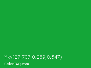 Yxy 27.707,0.289,0.547 Color is a normal green color and the nearest color is Green Pantone #00ad43. Hex code #14a638 and RGB value is rgb(20,166,56). In RGB color space, this color is composed of 8% red, 65% green, 22% blue, In CMYK color space, this color is composed of 88% cyan, 0% magenta, 66% yellow , 35% black , In HSL color space, this color has a hue angle of 135° , 78% saturation and 36% lightness.