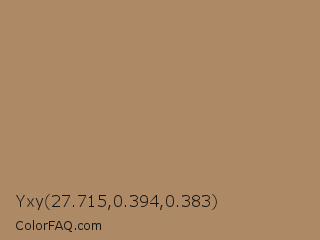 Yxy 27.715,0.394,0.383 Color is a normal orange color and the nearest color is Light Taupe #b38b6d. Hex code #ad8965 and RGB value is rgb(173,137,101). In RGB color space, this color is composed of 68% red, 54% green, 40% blue, In CMYK color space, this color is composed of 0% cyan, 21% magenta, 42% yellow , 32% black , In HSL color space, this color has a hue angle of 30° , 31% saturation and 54% lightness.