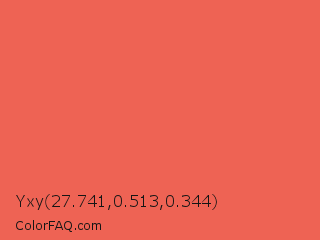 Yxy 27.741,0.513,0.344 Color is a light red color and the nearest color is Sunset Orange #fd5e53. Hex code #ee6354 and RGB value is rgb(238,99,84). In RGB color space, this color is composed of 93% red, 39% green, 33% blue, In CMYK color space, this color is composed of 0% cyan, 58% magenta, 65% yellow , 7% black , In HSL color space, this color has a hue angle of 6° , 82% saturation and 63% lightness.