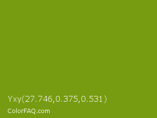 Yxy 27.746,0.375,0.531 Color is a normal lime color and the nearest color is Limeade #6f9d02. Hex code #779c12 and RGB value is rgb(119,156,18). In RGB color space, this color is composed of 47% red, 61% green, 7% blue, In CMYK color space, this color is composed of 24% cyan, 0% magenta, 88% yellow , 39% black , In HSL color space, this color has a hue angle of 76° , 79% saturation and 34% lightness.