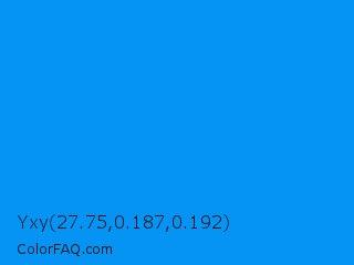 Yxy 27.75,0.187,0.192 Color is a normal blue color and the nearest color is Vivid Cerulean #00aaee. Hex code #0694f4 and RGB value is rgb(6,148,244). In RGB color space, this color is composed of 2% red, 58% green, 96% blue, In CMYK color space, this color is composed of 98% cyan, 39% magenta, 0% yellow , 4% black , In HSL color space, this color has a hue angle of 204° , 95% saturation and 49% lightness.