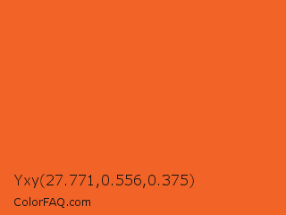 Yxy 27.771,0.556,0.375 Color is a normal orange color and the nearest color is Deep Carrot Orange #e9692c. Hex code #f16327 and RGB value is rgb(241,99,39). In RGB color space, this color is composed of 95% red, 39% green, 15% blue, In CMYK color space, this color is composed of 0% cyan, 59% magenta, 84% yellow , 5% black , In HSL color space, this color has a hue angle of 18° , 88% saturation and 55% lightness.