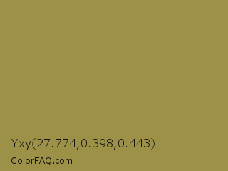 Yxy 27.774,0.398,0.443 Color is a normal yellow color and the nearest color is Sycamore #908d39. Hex code #9c9147 and RGB value is rgb(156,145,71). In RGB color space, this color is composed of 61% red, 57% green, 28% blue, In CMYK color space, this color is composed of 0% cyan, 7% magenta, 54% yellow , 39% black , In HSL color space, this color has a hue angle of 52° , 37% saturation and 45% lightness.