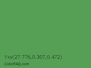 Yxy 27.776,0.307,0.472 Color is a normal green color and the nearest color is Fruit Salad #4f9d5d. Hex code #56a055 and RGB value is rgb(86,160,85). In RGB color space, this color is composed of 34% red, 63% green, 33% blue, In CMYK color space, this color is composed of 46% cyan, 0% magenta, 47% yellow , 37% black , In HSL color space, this color has a hue angle of 119° , 31% saturation and 48% lightness.