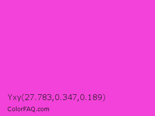 Yxy 27.783,0.347,0.189 Color is a normal magenta color and the nearest color is Purple Pizzazz #fe4eda. Hex code #f242d9 and RGB value is rgb(242,66,217). In RGB color space, this color is composed of 95% red, 26% green, 85% blue, In CMYK color space, this color is composed of 0% cyan, 73% magenta, 10% yellow , 5% black , In HSL color space, this color has a hue angle of 309° , 87% saturation and 60% lightness.