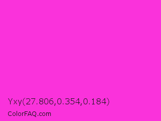 Yxy 27.806,0.354,0.184 Color is a normal magenta color and the nearest color is Razzle Dazzle Rose #ff33cc. Hex code #fa32db and RGB value is rgb(250,50,219). In RGB color space, this color is composed of 98% red, 20% green, 86% blue, In CMYK color space, this color is composed of 0% cyan, 80% magenta, 12% yellow , 2% black , In HSL color space, this color has a hue angle of 309° , 95% saturation and 59% lightness.