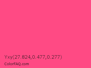 Yxy 27.824,0.477,0.277 Color is a light rose color and the nearest color is Sasquatch Socks #ff4681. Hex code #ff4a84 and RGB value is rgb(255,74,132). In RGB color space, this color is composed of 100% red, 29% green, 52% blue, In CMYK color space, this color is composed of 0% cyan, 71% magenta, 48% yellow , 0% black , In HSL color space, this color has a hue angle of 341° , 100% saturation and 65% lightness.