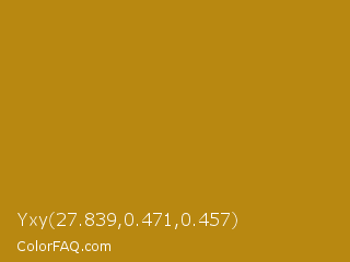 Yxy 27.839,0.471,0.457 Color is a normal orange color and the nearest color is Dark Goldenrod #b8860b. Hex code #b88811 and RGB value is rgb(184,136,17). In RGB color space, this color is composed of 72% red, 53% green, 7% blue, In CMYK color space, this color is composed of 0% cyan, 26% magenta, 91% yellow , 28% black , In HSL color space, this color has a hue angle of 43° , 83% saturation and 39% lightness.