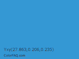 Yxy 27.863,0.206,0.235 Color is a normal blue color and the nearest color is Curious Blue #2596d1. Hex code #3398d4 and RGB value is rgb(51,152,212). In RGB color space, this color is composed of 20% red, 60% green, 83% blue, In CMYK color space, this color is composed of 76% cyan, 28% magenta, 0% yellow , 17% black , In HSL color space, this color has a hue angle of 202° , 65% saturation and 52% lightness.