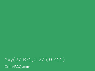 Yxy 27.871,0.275,0.455 Color is a normal green color and the nearest color is Chateau Green #40a860. Hex code #35a364 and RGB value is rgb(53,163,100). In RGB color space, this color is composed of 21% red, 64% green, 39% blue, In CMYK color space, this color is composed of 67% cyan, 0% magenta, 39% yellow , 36% black , In HSL color space, this color has a hue angle of 146° , 51% saturation and 42% lightness.