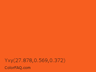 Yxy 27.878,0.569,0.372 Color is a normal orange color and the nearest color is Giants Orange #fe5a1d. Hex code #f75e1f and RGB value is rgb(247,94,31). In RGB color space, this color is composed of 97% red, 37% green, 12% blue, In CMYK color space, this color is composed of 0% cyan, 62% magenta, 87% yellow , 3% black , In HSL color space, this color has a hue angle of 18° , 93% saturation and 55% lightness.