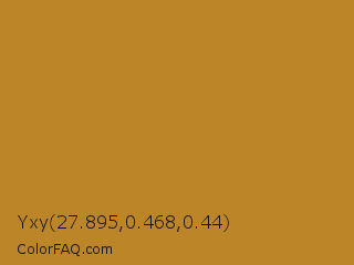 Yxy 27.895,0.468,0.44 Color is a normal orange color and the nearest color is University Of California Gold #b78727. Hex code #bc8628 and RGB value is rgb(188,134,40). In RGB color space, this color is composed of 74% red, 53% green, 16% blue, In CMYK color space, this color is composed of 0% cyan, 29% magenta, 79% yellow , 26% black , In HSL color space, this color has a hue angle of 38° , 65% saturation and 45% lightness.
