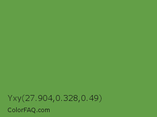 Yxy 27.904,0.328,0.49 Color is a normal green color and the nearest color is Palm Leaf #6f9940. Hex code #639f47 and RGB value is rgb(99,159,71). In RGB color space, this color is composed of 39% red, 62% green, 28% blue, In CMYK color space, this color is composed of 38% cyan, 0% magenta, 55% yellow , 38% black , In HSL color space, this color has a hue angle of 101° , 38% saturation and 45% lightness.