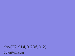 Yxy 27.914,0.236,0.2 Color is a light indigo color and the nearest color is Chetwode Blue #8581d9. Hex code #8886e6 and RGB value is rgb(136,134,230). In RGB color space, this color is composed of 53% red, 53% green, 90% blue, In CMYK color space, this color is composed of 41% cyan, 42% magenta, 0% yellow , 10% black , In HSL color space, this color has a hue angle of 241° , 66% saturation and 71% lightness.