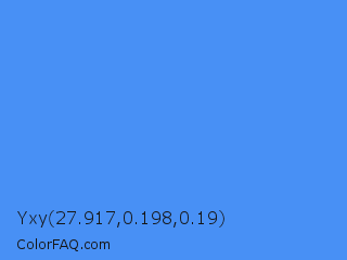 Yxy 27.917,0.198,0.19 Color is a light blue color and the nearest color is Blueberry #4f86f7. Hex code #4890f5 and RGB value is rgb(72,144,245). In RGB color space, this color is composed of 28% red, 56% green, 96% blue, In CMYK color space, this color is composed of 71% cyan, 41% magenta, 0% yellow , 4% black , In HSL color space, this color has a hue angle of 215° , 90% saturation and 62% lightness.