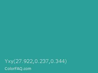 Yxy 27.922,0.237,0.344 Color is a normal cyan color and the nearest color is Zomp #39a78e. Hex code #2ba098 and RGB value is rgb(43,160,152). In RGB color space, this color is composed of 17% red, 63% green, 60% blue, In CMYK color space, this color is composed of 73% cyan, 0% magenta, 5% yellow , 37% black , In HSL color space, this color has a hue angle of 176° , 58% saturation and 40% lightness.