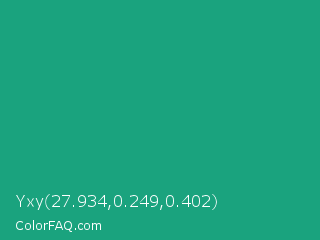 Yxy 27.934,0.249,0.402 Color is a normal cyan color and the nearest color is Green Crayola #1cac78. Hex code #1aa37e and RGB value is rgb(26,163,126). In RGB color space, this color is composed of 10% red, 64% green, 49% blue, In CMYK color space, this color is composed of 84% cyan, 0% magenta, 23% yellow , 36% black , In HSL color space, this color has a hue angle of 164° , 72% saturation and 37% lightness.
