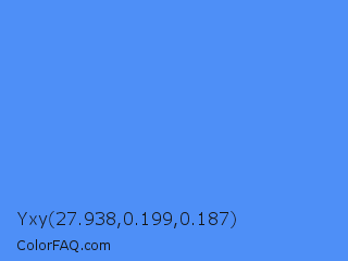 Yxy 27.938,0.199,0.187 Color is a light blue color and the nearest color is Blueberry #4f86f7. Hex code #4e8ff7 and RGB value is rgb(78,143,247). In RGB color space, this color is composed of 31% red, 56% green, 97% blue, In CMYK color space, this color is composed of 68% cyan, 42% magenta, 0% yellow , 3% black , In HSL color space, this color has a hue angle of 217° , 91% saturation and 64% lightness.