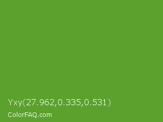 Yxy 27.962,0.335,0.531 Color is a normal green color and the nearest color is Green RYB #66b032. Hex code #5ca12e and RGB value is rgb(92,161,46). In RGB color space, this color is composed of 36% red, 63% green, 18% blue, In CMYK color space, this color is composed of 43% cyan, 0% magenta, 71% yellow , 37% black , In HSL color space, this color has a hue angle of 96° , 56% saturation and 41% lightness.