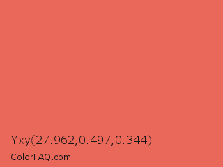 Yxy 27.962,0.497,0.344 Color is a light red color and the nearest color is Terracotta #e2725b. Hex code #e9685a and RGB value is rgb(233,104,90). In RGB color space, this color is composed of 91% red, 41% green, 35% blue, In CMYK color space, this color is composed of 0% cyan, 55% magenta, 61% yellow , 9% black , In HSL color space, this color has a hue angle of 6° , 76% saturation and 63% lightness.