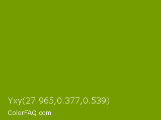 Yxy 27.965,0.377,0.539 Color is a normal lime color and the nearest color is Limeade #6f9d02. Hex code #769d00 and RGB value is rgb(118,157,0). In RGB color space, this color is composed of 46% red, 62% green, 0% blue, In CMYK color space, this color is composed of 25% cyan, 0% magenta, 100% yellow , 38% black , In HSL color space, this color has a hue angle of 75° , 100% saturation and 31% lightness.