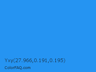 Yxy 27.966,0.191,0.195 Color is a normal blue color and the nearest color is Button Blue #24a0ed. Hex code #2594f2 and RGB value is rgb(37,148,242). In RGB color space, this color is composed of 15% red, 58% green, 95% blue, In CMYK color space, this color is composed of 85% cyan, 39% magenta, 0% yellow , 5% black , In HSL color space, this color has a hue angle of 208° , 89% saturation and 55% lightness.